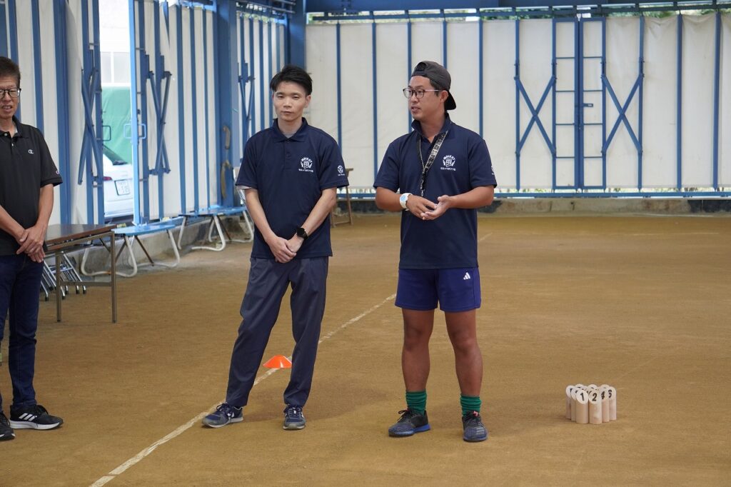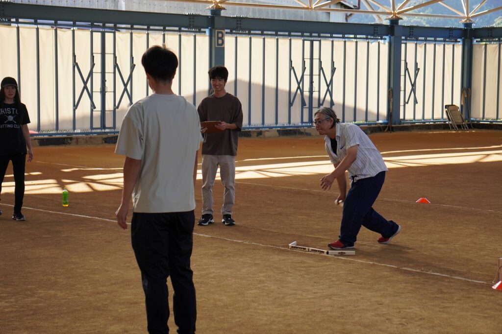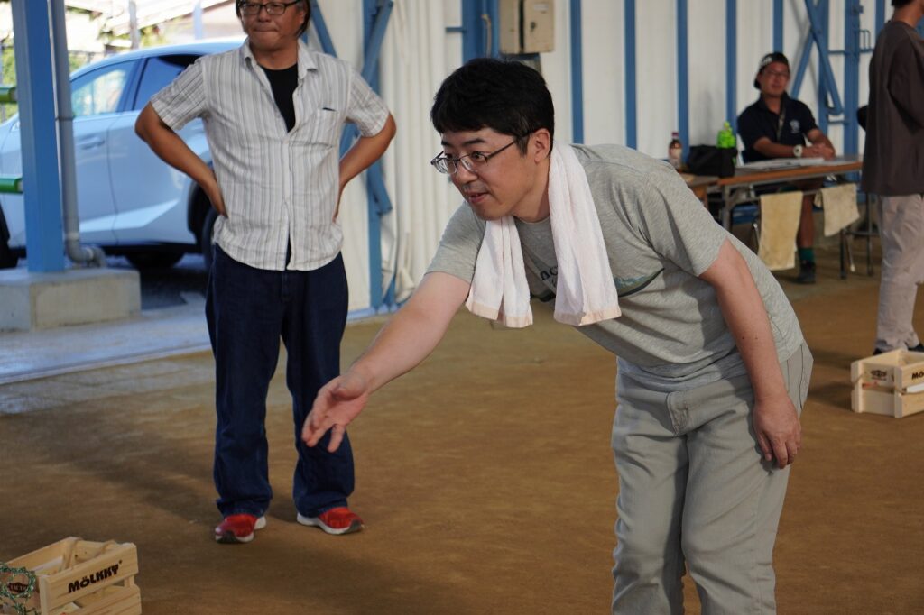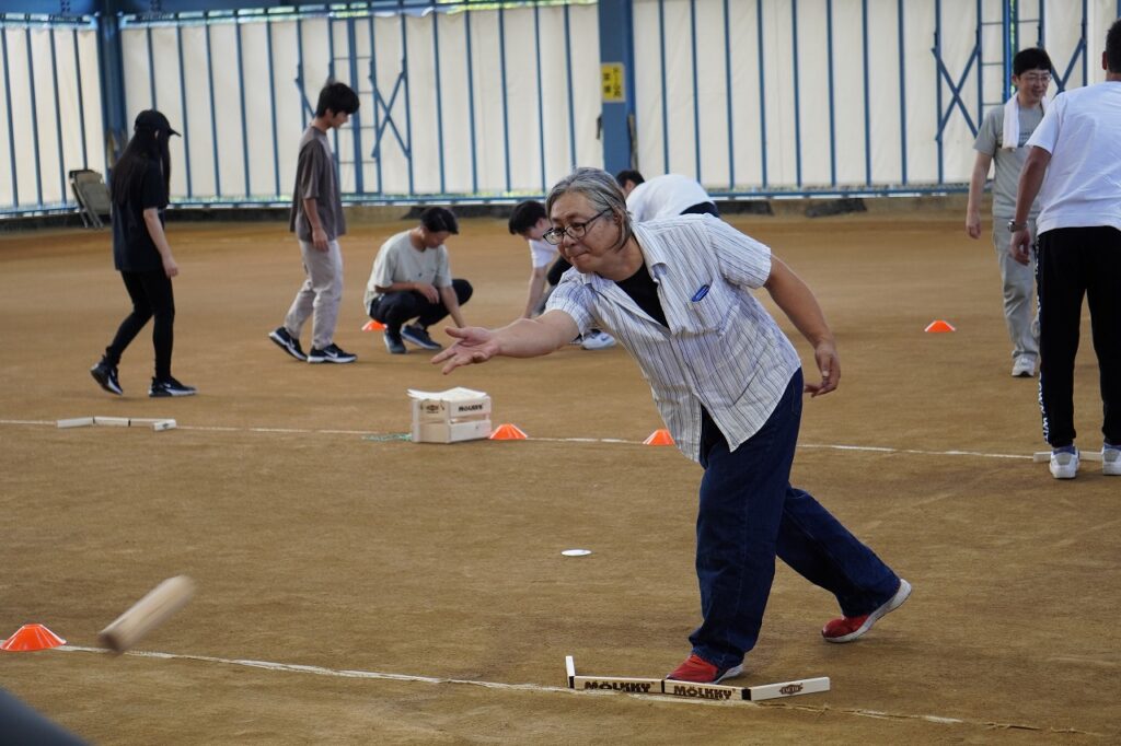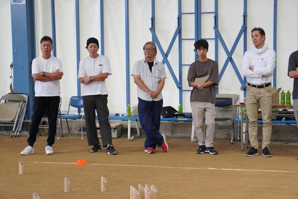 ルール説明、練習を行い、ほくと舞鵬会の福原会長、ほくと鵬信会の白石会長の始球式で大会がスタートしました。大会は3人1チームで試合を行いましたが、非常に盛り上がり、また、チームの絆が見られる場面も多々ありました。初めての方も多かったですが、分かりやすいルール説明や指導方法により初心者の方にも楽しんでいただけました。