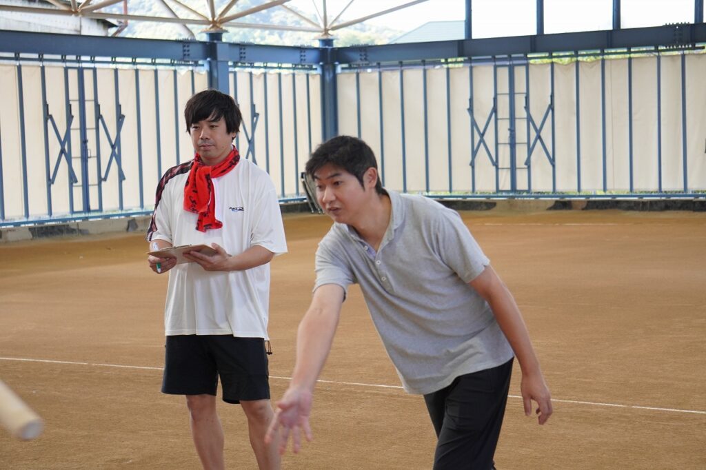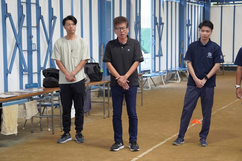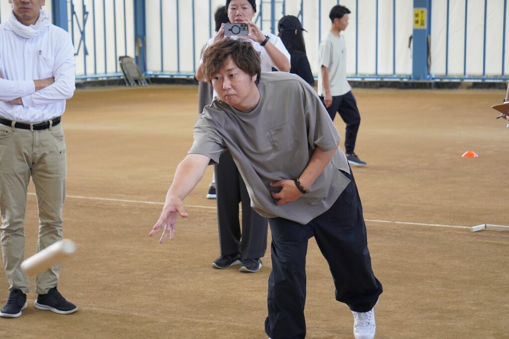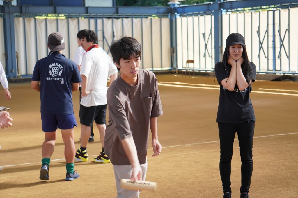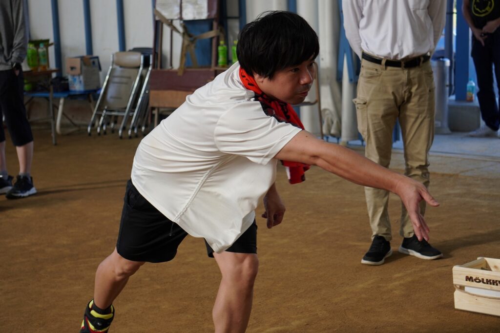 ルール説明、練習を行い、ほくと舞鵬会の福原会長、ほくと鵬信会の白石会長の始球式で大会がスタートしました。大会は3人1チームで試合を行いましたが、非常に盛り上がり、また、チームの絆が見られる場面も多々ありました。初めての方も多かったですが、分かりやすいルール説明や指導方法により初心者の方にも楽しんでいただけました。